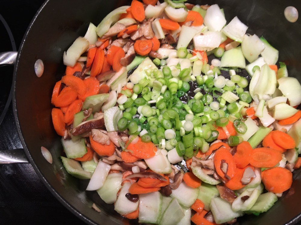 In medium stock pot, heat canola oil making sure it covers bottom of pan well. Saute carrots, mushrooms, white parts of scallions and the white parts of the bok choy on medium hight heat. Stir for 2-4 minutes until vegetables soften slightly. Add salt and pepper and grated ginger. Stir for 3-4 minutes. Make sure nothing is sticking to bottom of pot.